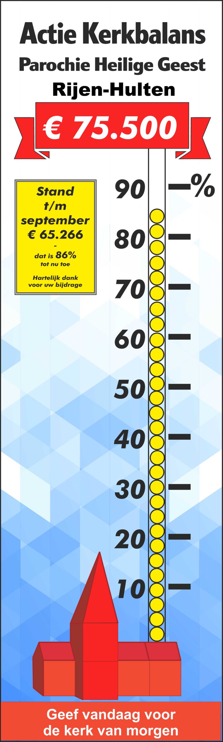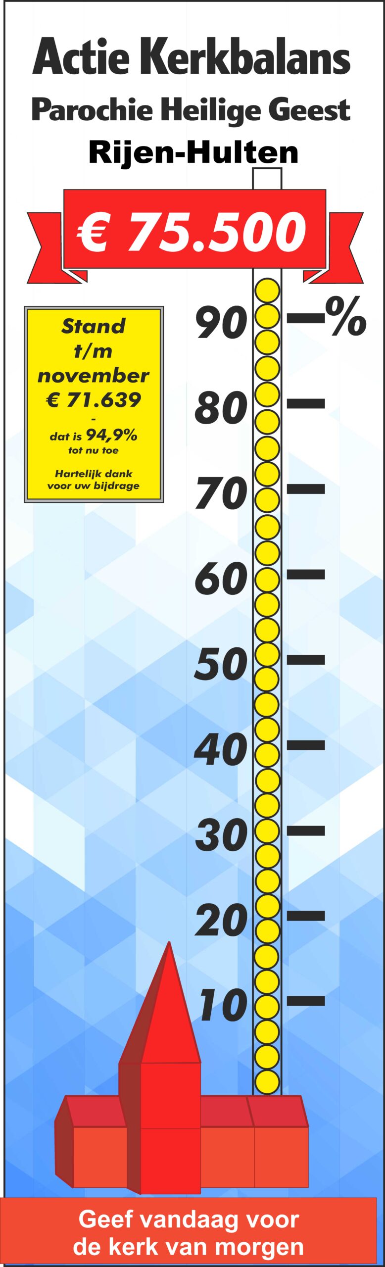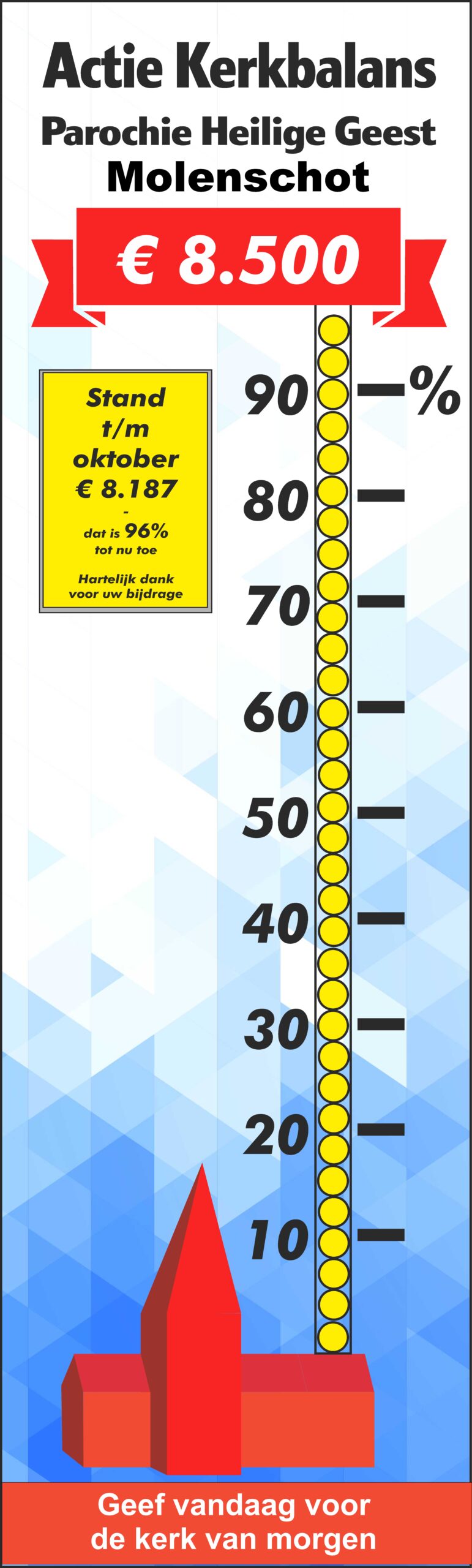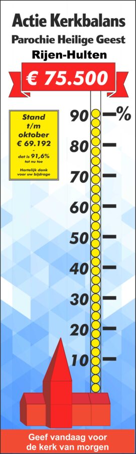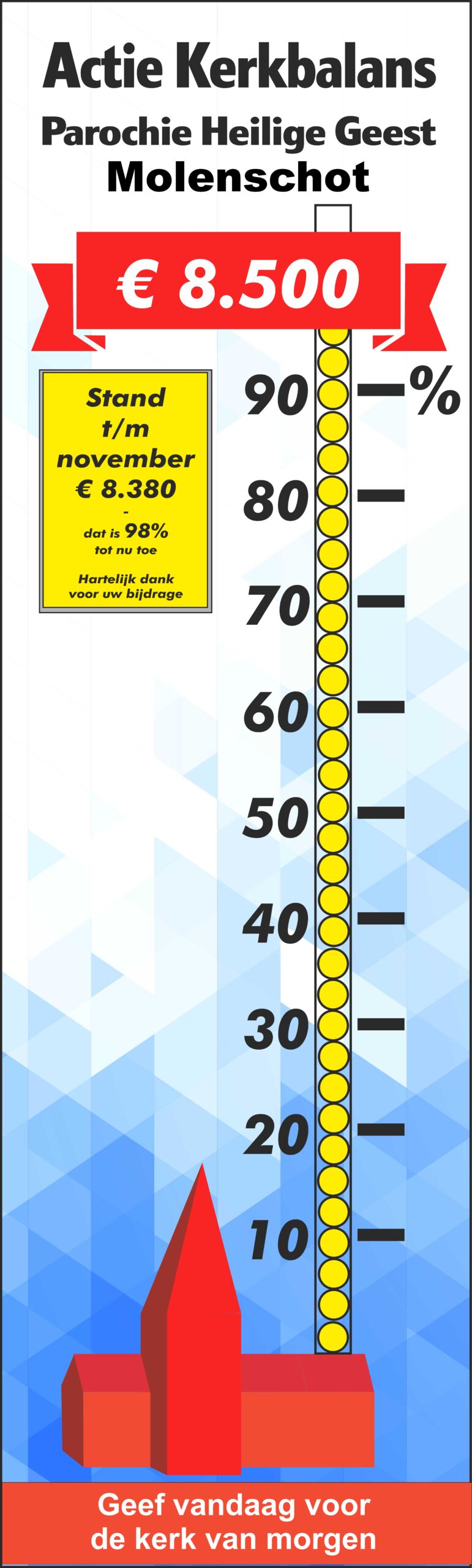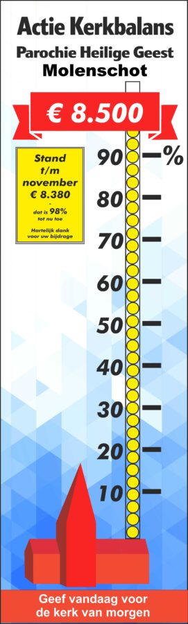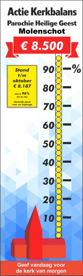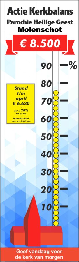 € 84.000 is hiermee nog niet behaald, we zijn wel op de goede weg! Wij danken u heel hartelijk voor uw bijdrage. In de kerken van Molenschot en Rijen houden we de stand van zaken bij met een levensgrote thermometer.