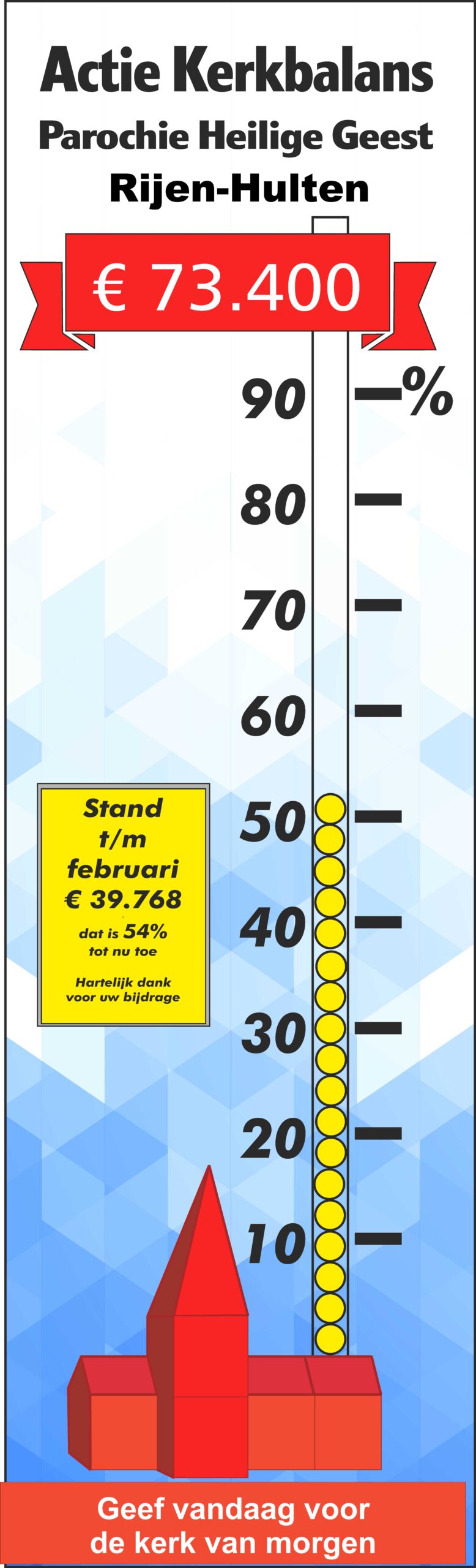 € 81.500 is hiermee nog lang niet in zicht, maar het is wel een mooi begin. Wij danken u heel hartelijk voor uw bijdrage. In de kerken van Molenschot en Rijen houden we de stand van zaken bij met een levensgrote thermometer.