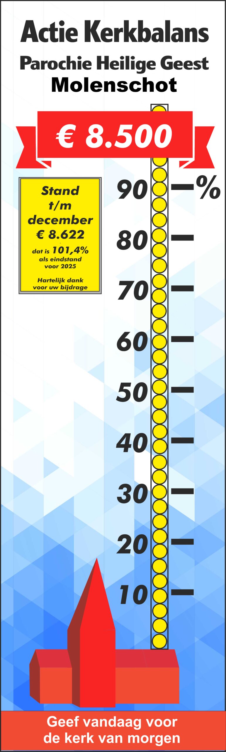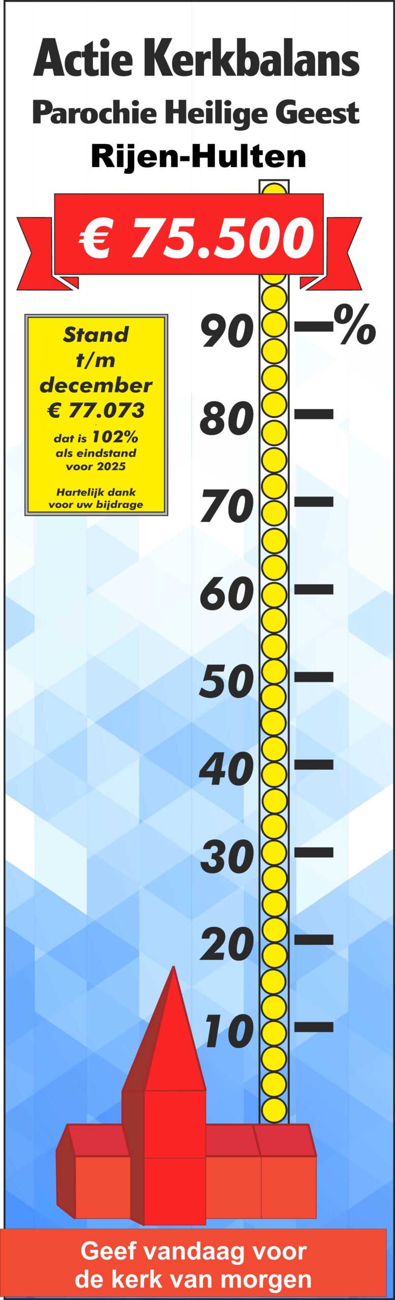 € 84.000 is hiermee ruimschoots behaald. Wij danken u heel hartelijk voor uw bijdrage. In de kerken van Molenschot en Rijen houden we de stand van zaken bij met een levensgrote thermometer.