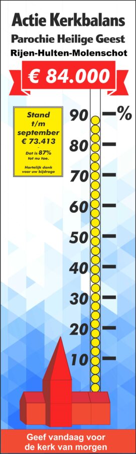 Wij zien uw betaling graag tegemoet op rekening NL19 RABO 0145 1030 80 t.n.v. Parochie Heilige Geest met vermelding van ‘Parochiebijdrage 2025’.Met uw bijdrage moet het toch gaan lukken om het streefbedrag te halen en het boekjaar positief af te sluiten. Kijk voor het resultaat in de kerk op de levensgrote thermometer, zowel in Rijen als in Molenschot.