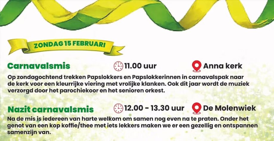 De Carnavalsviering in Papslokkersgat is op zondag 15 februari om 11.00 uur in de Annakerk aan de Kapelstraat in Molenschot. De muziek wordt verzorgd door het Parochiekoor en het Seniorenorkest.
