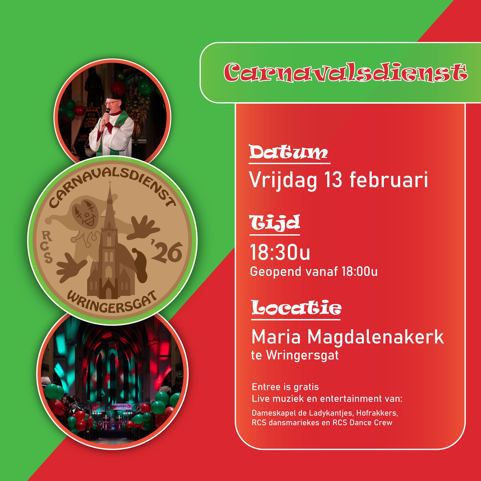 De Carnavalsviering in Wringersgat is op vrijdag 13 februari om 18.30 uur in de Maria Magdalenakerk aan de Hoofdstraat 60 in Rijen. Om 18.00 uur staat de blaaskapel bij de ingang om de mensen ‘naar binnen te blazen’.
