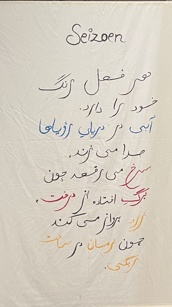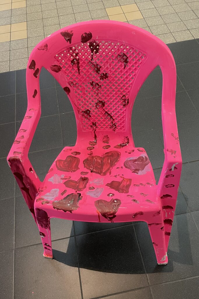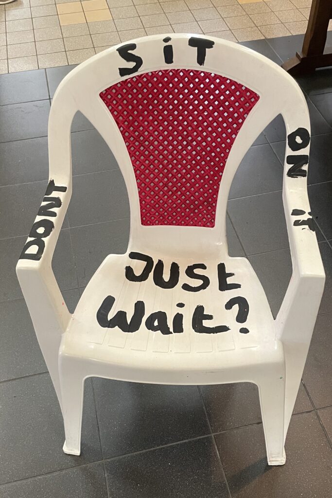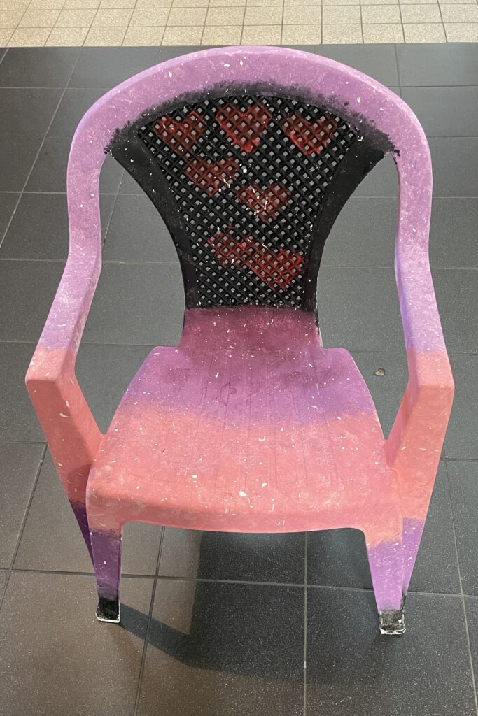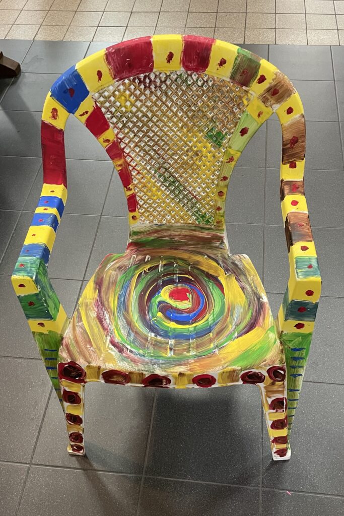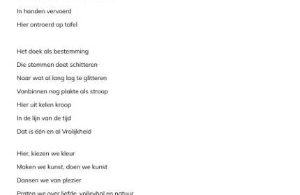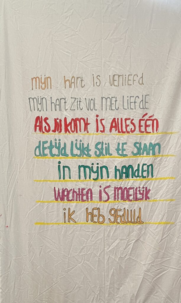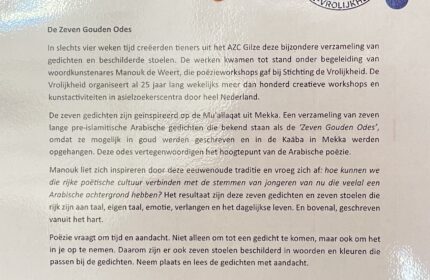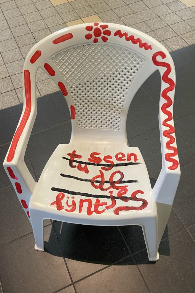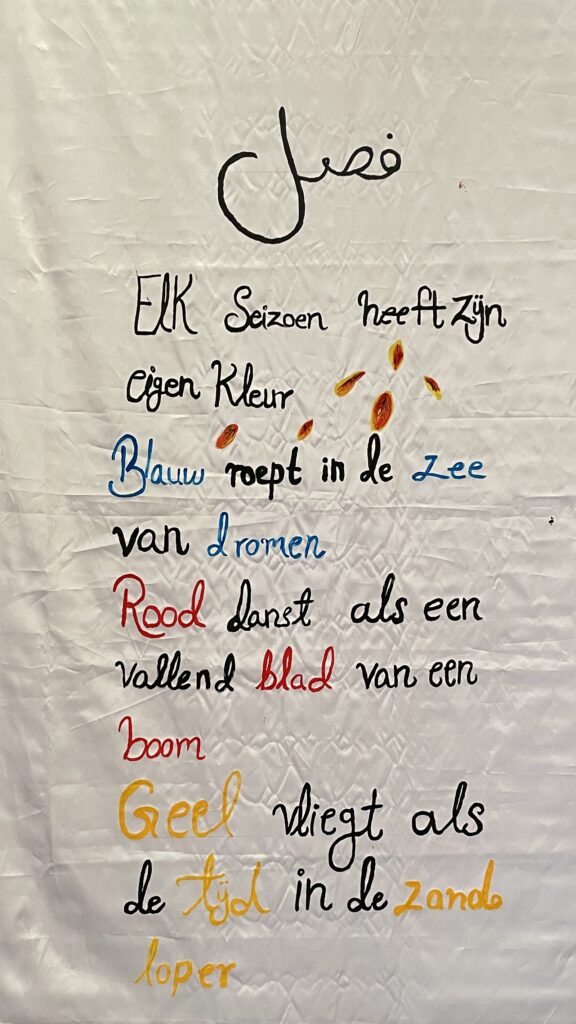 We zagen ook de ‘gouden odes’ van 6 kinderen van AZC Prinsenbosch. Onder leiding van Spoken Word Artist Manouk de Weert vertrouwden de kinderen hun hoop voor de toekomst toe aan taal, gekleurd geschreven op een groot doek. Elke Gouden Ode voorzien van een bijpassende beschilderde stoel. Gezeten op die stoel kun je de poëzie rustig op je in laten werken.