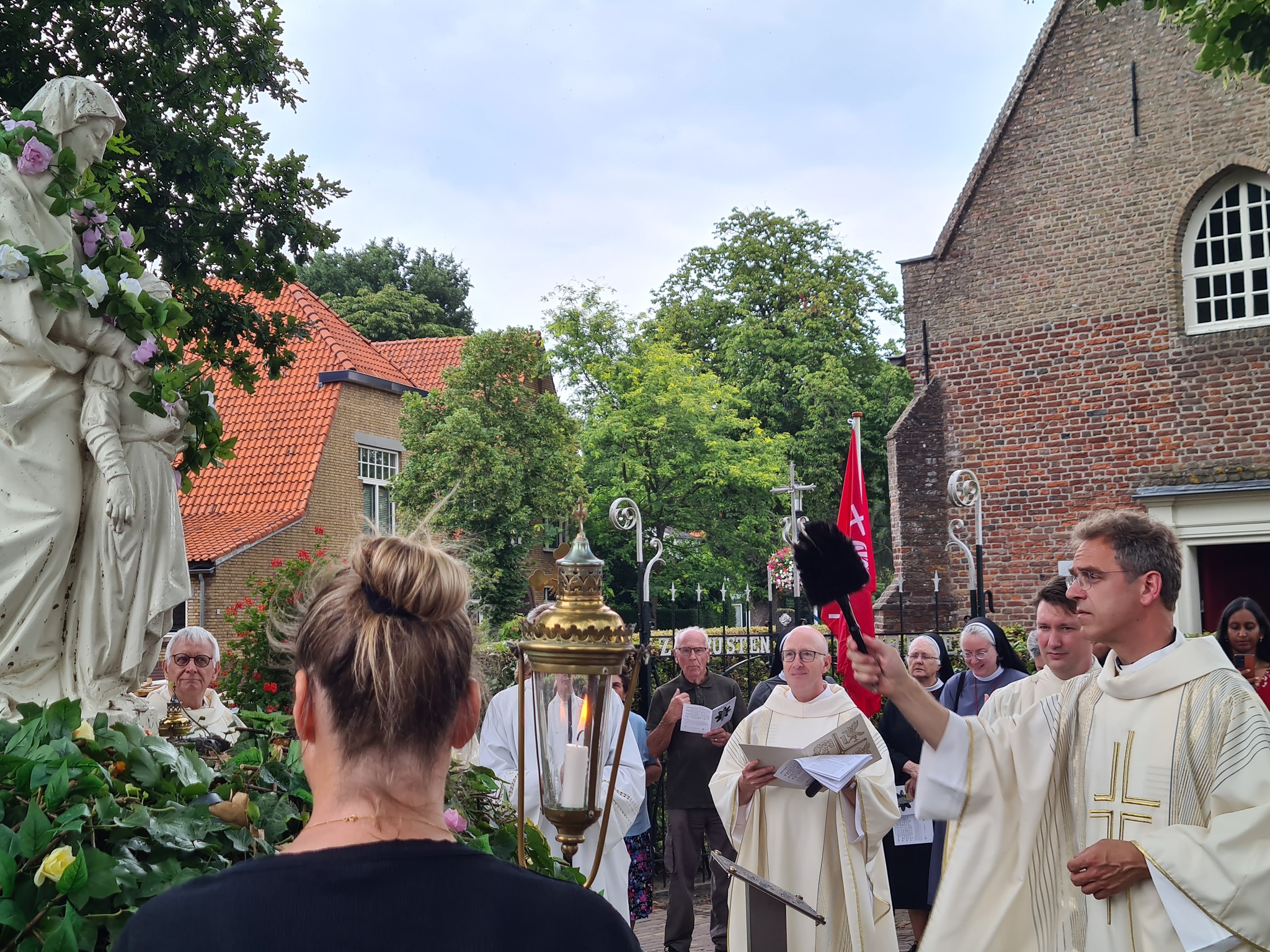 De zegen door vicaris Robert Schnell aan het einde van de viering werd buiten bij het beeld van de heilige Anna op het pleintje voor de Annakapel gegeven nadat de voorganger dit beeld met wijwater had gezegend.